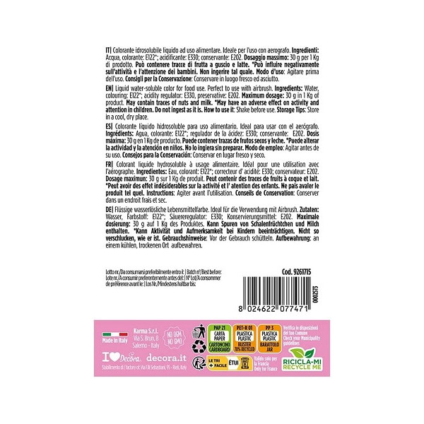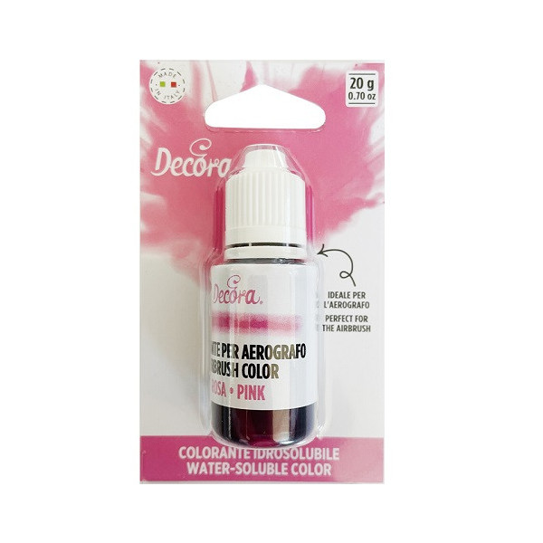 Colorante idrosolubile liquido rosa uso alimentare in bottiglia da 20 g di Decora. Ideale per aerografo, per colorare e decorare dolci.