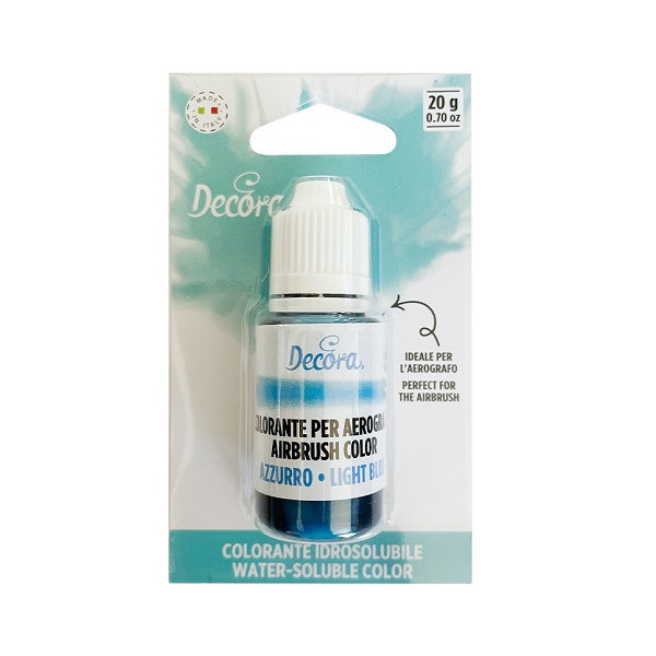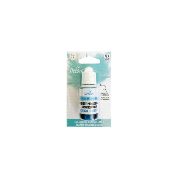Colorante idrosolubile liquido azzurro uso alimentare in bottiglia da 20 g di Decora. Ideale per aerografo, per colorare e decorare dolci.