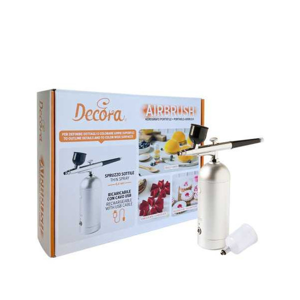 Starter Kit per aerografare composto da un aerografo Airbrush portatile Decora, più un set di 11 coloranti idrosolubili liquidi ad uso alimentare da 20 g