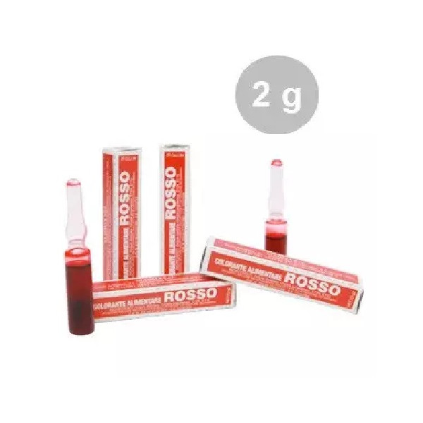 Fialetta da 2 g di colore rosso, per uso alimentare, ad alta concentrazione, specifico per pasta di zucchero e preparati.
