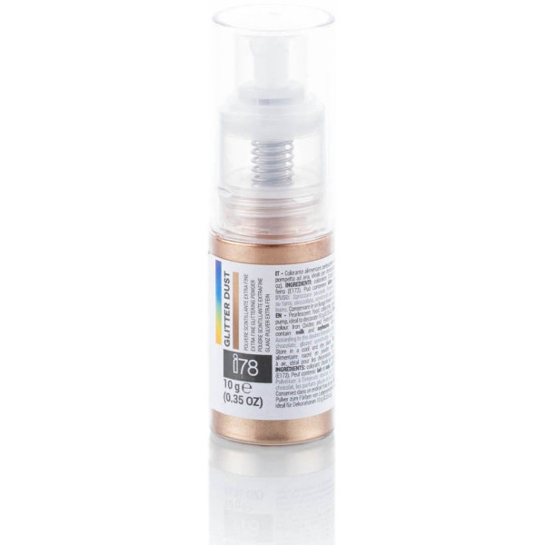 Glitter Dust Bronze da 10 g, , dalla linea i78 di Silikomart: colorante Spry Glitterato Bronzo in Polvere Scintillante Extra-fine con pompetta ad aria da spruzzare secondo l’intensità desiderata su torte, cioccolato, semifreddi glassati e crema al burro