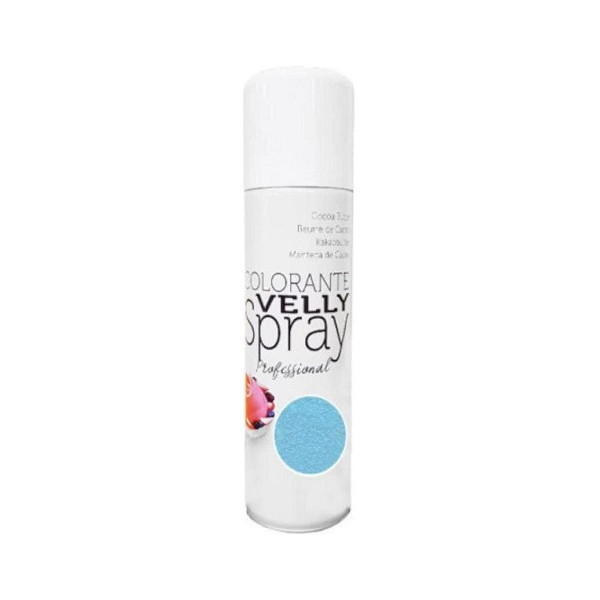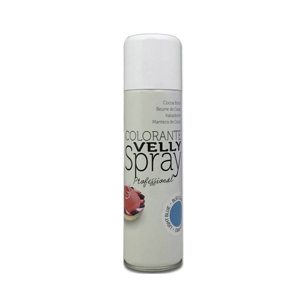 Velly Light Blue da 250 ml di Via delle Arti da Volcke Aerosol: colorante spray color azzurro ad effetto velluto, uso alimentare, con burro di cacao, ideale per decorare preparazioni e superfici congelate.