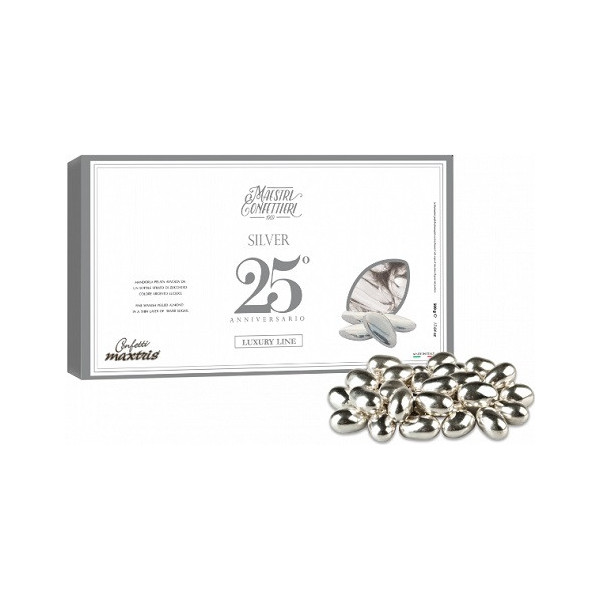 Confetti al Cioccolato Maxtris Argento 500 g: cioccolato fondente, ricoperto da un sottile strato di zucchero argentato. Ideali per venticinquesimo anniversario di matrimonio.
