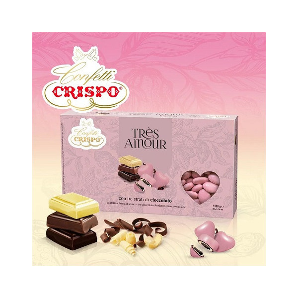 Confetti Très Amour Rosa di Crispo: un cuore di cioccolato fondente, bianco e al latte, confettato color rosa in confezione da 1Kg da Crispo