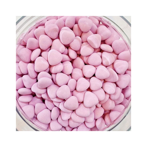 Cuoricini mignon rosa Crispo 1 Kg: confetti rosa a forma piccoli cuori di cioccolato fondente, ricoperti da un croccante stato di zucchero, ideali per decorazioni e confettata
