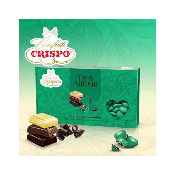 Confetti Très Amour Verde per cerimonia, a forma di cuore con cioccolato fondente, bianco e al latte e ricoperti da un soffice velo di zucchero profumato, in scatola Crispo.