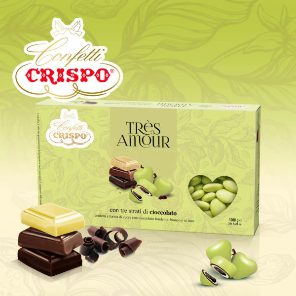 Confetti Très Amour Verde di Crispo: un cuore di cioccolato fondente, bianco e al latte, confettato color verde in confezione da 1Kg di Crispo