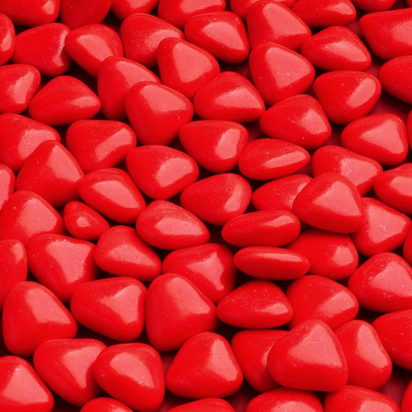 Cuoricini mignon rosso Crispo 1 Kg: confetti rossi a forma piccoli cuori di cioccolato fondente, ricoperti da un croccante stato di zucchero, ideali per decorazioni e confettata
