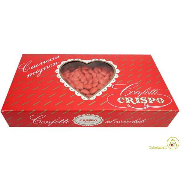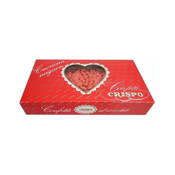 Cuoricini mignon rossi Crispo: confetti a forma di cuore, al cioccolato fondente e ricoperti da un soffice velo di zucchero profumato, in scatola cuoricini mignon Crispo.