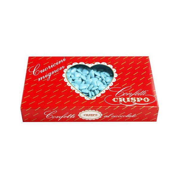 Cuoricini mignon celeste Crispo: confetti a forma di cuore, al cioccolato fondente e ricoperti da un soffice velo di zucchero profumato, in scatola cuoricini mignon Crispo.