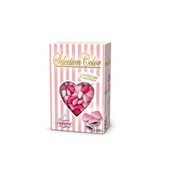 Confetti Cuoricini Mignon sfumati Rosa per cerimonia, a forma di cuore, al cioccolato fondente e ricoperti da un soffice velo di zucchero profumato, in scatola Cuoricini Mignon Crispo.