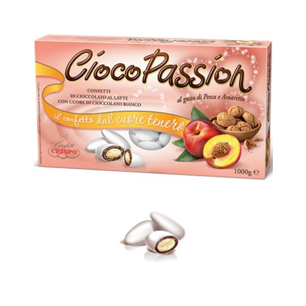 Ciocopassion pesche e amaretto Crispo: confetti bianchi a cioccolato bianco a gusto di pesche e amaretto ricoperti di cioccolato al latte, in confezione da 1000 g.