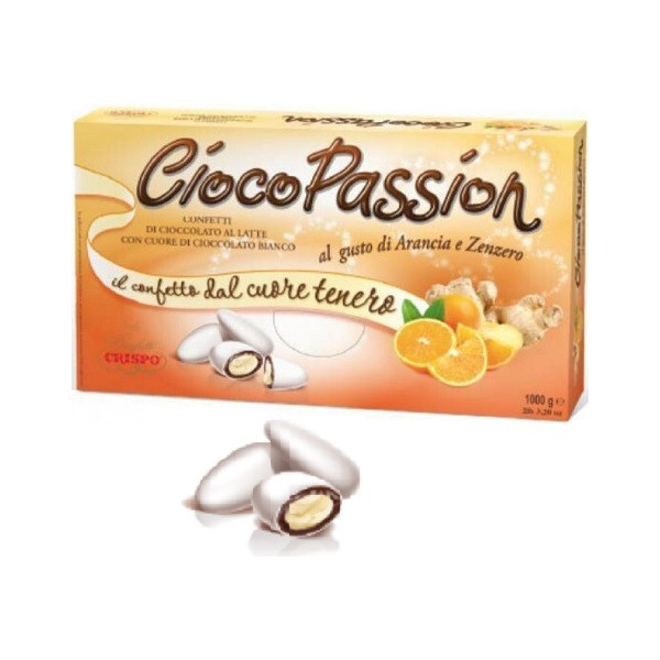 Ciocopassion arancia e zenzero Crispo da 1 Kg: confetti bianchi con cioccolato bianco al gusto di crema arancia e zenzero, ricoperti di cioccolato al latte, ideali per confettata