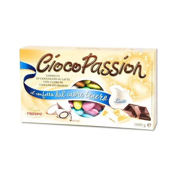 Ciocopassion colori assortiti Crispo: confetti, colori assortiti, di cioccolato al latte ripieni al cioccolato bianco in confezione da 1 Kg di Crispo, ideali per confettata
