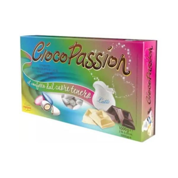 Confetti Ciocopassion colori assortiti al cioccolato al latte, sono confetti con cioccolato bianco ricoperto di purissimo cioccolato al latte, il tutto ricoperto da un sottilissimo strato di zucchero, in confezione da 1000 gr.