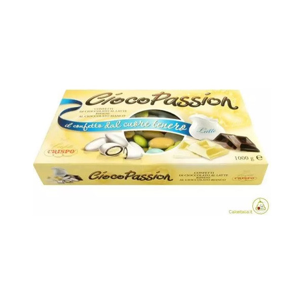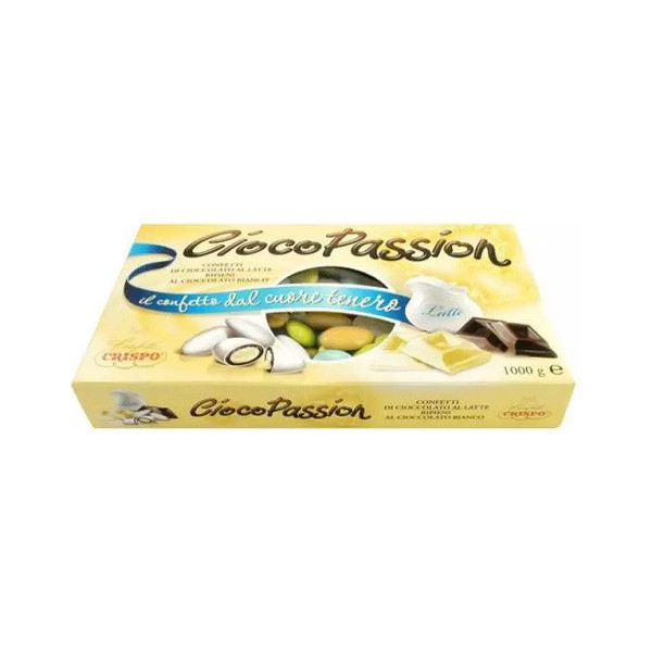 Ciocopassion assortiti bianchi Crispo: 1 Kg di un mix di confetti bianchi con cioccolato al latte ripieni di gusti assortiti, ideali per confettata bianca gustosa.