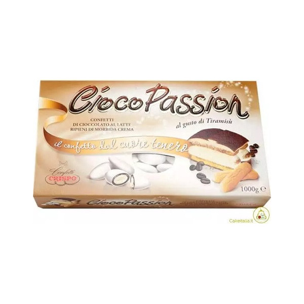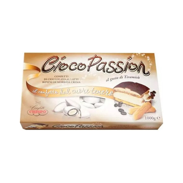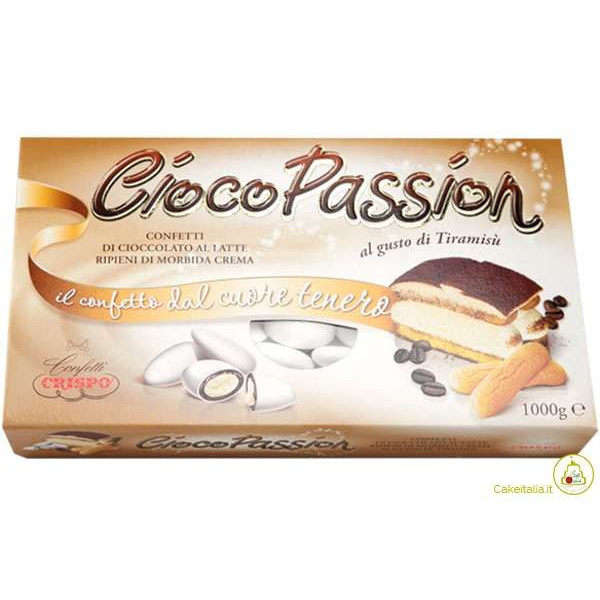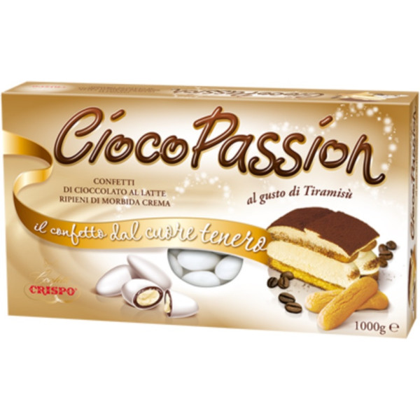 Ciocopassion al tiramisù Crispo: confetti bianchi al cioccolato al latte, sono confetti con cioccolato bianco al tiramisù ricoperto di purissimo cioccolato al latte, il tutto ricoperto da un sottilissimo strato di zucchero, in confezione da 1000 g.