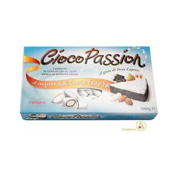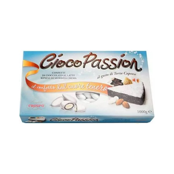 Ciocopassion torta caprese da 1 Kg di Crispo: confetti bianchi di cioccolato al latte ripieni di morbida crema al gusto di torta caprese, ideali per confettata gustosa