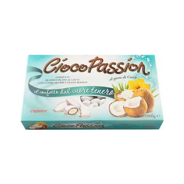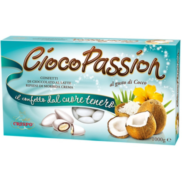 Confetti Ciocopassion cocco da 1 Kg di Crispo: confetti bianchi, di cioccolato al latte ripieni di morbida crema al gusto di cocco in confezione da 1 Kg di Crispo.