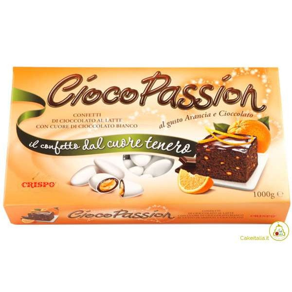 Ciocopassion arancia e cioccolato Crispo: confetti bianchi, al cioccolato al latte con cuore di cioccolato bianco al gusto di arancia e cioccolato, in confezione da 1000 gr.