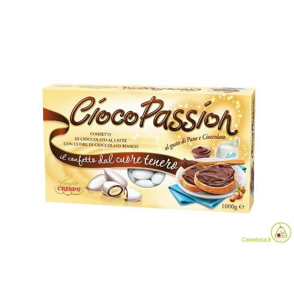 Ciocopassion pane e cioccolato Crispo 1 Kg: confetti bianchi al cioccolato al latte con cuore di cioccolato bianco al gusto di pane e cioccolato, in confezione da 1000 g.