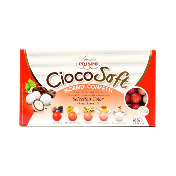 CiocoSoft Selection Color Rossi Crispo, morbidi confetti tondi Sfumati Rossi di cioccolato al latte con un cuore cremoso al latte ai gusti Frutti di Bosco, Meringa e Albicocca, Pistacchio, Creme Caramel, Cremoso alla Nocciola in confezione da 900 g