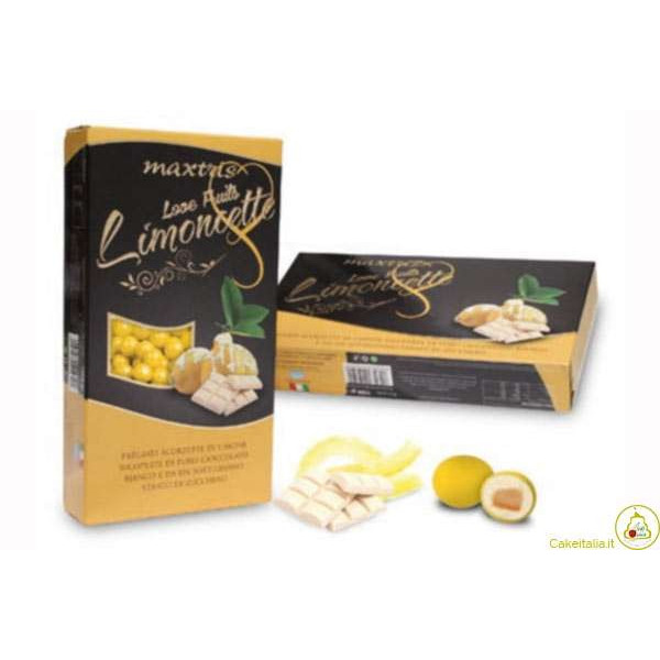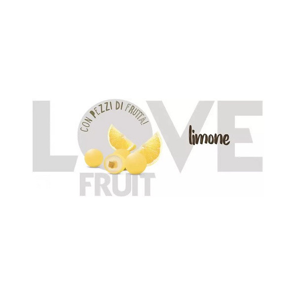 Love Fruit Limone confetti gialli tondi alla frutta Maxtris 1 Kg: scorzetta di limone candita ricoperte da cioccolato fondente e confettati color giallo.