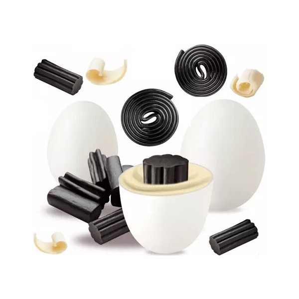 Liquirizia avvolta da uno strato di cioccolato bianco e ricoperta da un sottile strato di zucchero in confezione da 1 Kg.