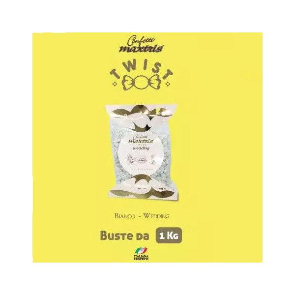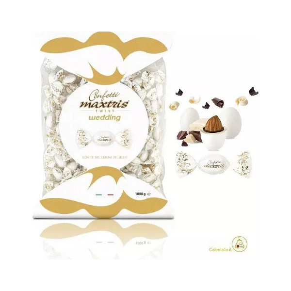 Busta Twist Maxtris Bianco Wedding: confetti con mandorla tostata ricoperta da cioccolato fondente e bianco e da un sottile strato di zucchero in busta da 1 Kg