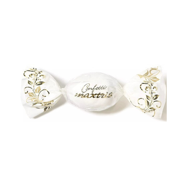 Twist Maxtris Liquore Strega confetti bianchi incartati in busta da 1 Kg: mandorla tostata avvolta da uno strato di cioccolato bianco al gusto liquore strega, ricoperta da un sottile strato di zucchero.