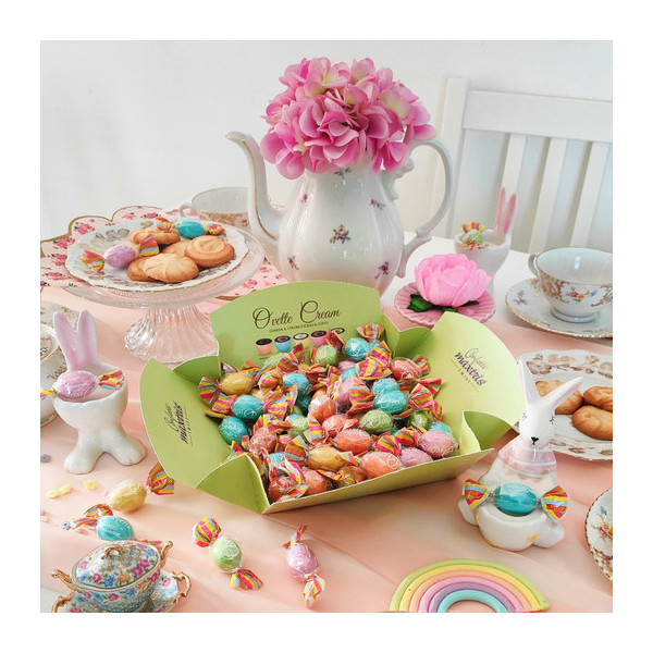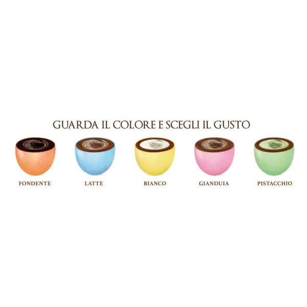 Ovette di cioccolato confettate colorate, ripiene di crema a gusti assortiti.