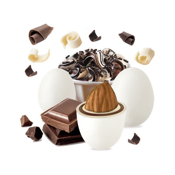 Twist Maxtris Affogato al Cioccolato confetti bianchi incartati in busta da 1 Kg: mandorla tostata ricoperta da cioccolato bianco e al latte e da un sottile strato di zucchero