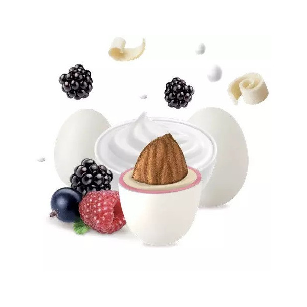 Ripieno: cioccolato bianco aromatizzato al gusto yogurt ai frutti di bosco