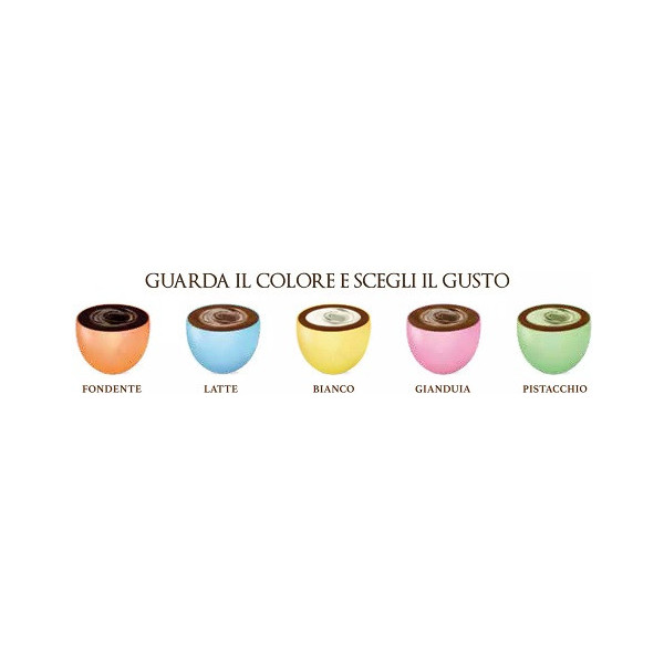 Ovette di cioccolato confettate colorate, ripiene di crema a gusti assortiti ed incartate singolarmente in confezione twist (caramella doppio fiocco)