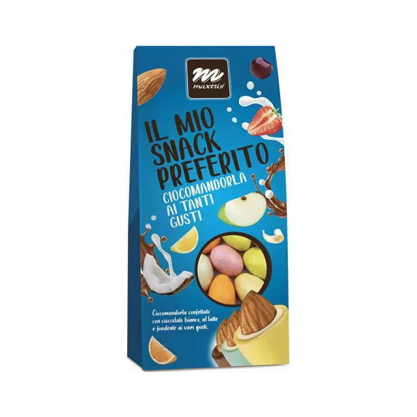 Sacchetto Maxtris Mix di gusti assortiti. Snack composto da mandorla tostata ricoperta da cioccolato al latte o fondente ai gusti assortiti, e da un sottile strato di zucchero.