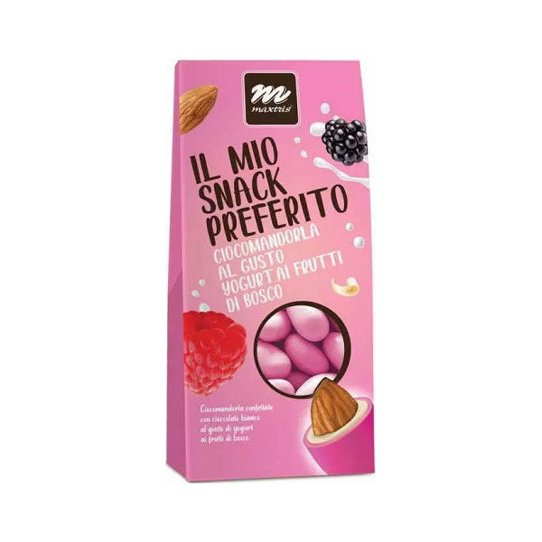 Sacchetto Maxtris Yogurt ai Frutti di Bosco. Snack ciocomandorla fucsia, composto da mandorla tostata ricoperta da cioccolato bianco al gusto di Yogurt ai Frutti di Bosco e da un sottile strato di zucchero.