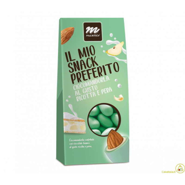 Sacchetto Maxtris Ricotta e Pera. Snack ciocomandorla verde, composto da mandorla tostata ricoperta da cioccolato bianco al gusto di torta ricotta e pera e da un sottile strato di zucchero.