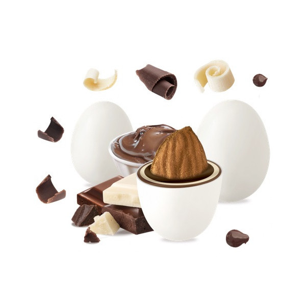 Maxtris Noce, confetti Ciocomandorla bianchi da 1 Kg: mandorla tostata ricoperta da cioccolato bianco gusto noce e da un sottile stato di zucchero, ideali per confettata.
