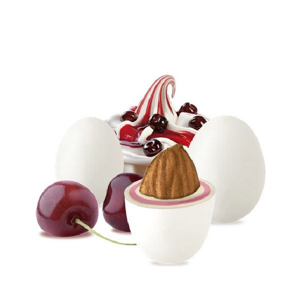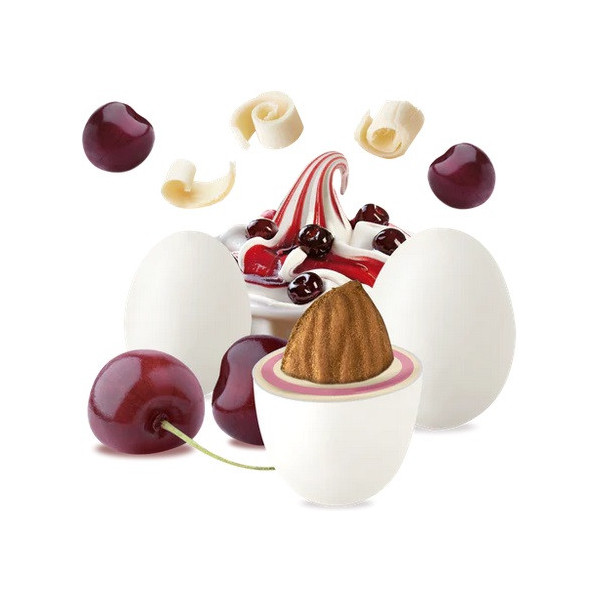 Confetto alla mandorla tostata avvolta da uno strato di cioccolato bianco al gusto di panna e amarena, ricoperto da un sottile strato di zucchero bianco.
