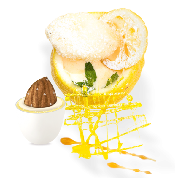 Con Mandorla tostata e salata, avvolta da cioccolato bianco al gusto di vaniglia, con note aromatiche di limoni, crunch di meringhe e da un sottile strato di zucchero, ricrea l'inconfondibile sapore della Delizia al Limone, dolce tipico della costiera Amalfitana