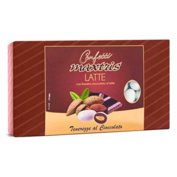 Confetti Maxtris Latte da 1 Kg: confetti bianchi Maxtris, con mandorla tostata ricoperta da cioccolato al latte. I confetti Maxtris ciocomandorla sono perfetti per sacchetti, confettata e bomboniere.