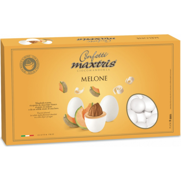 Maxtris Melone confetti Bianchi Maxtris 1 Kg: mandorla tostata ricoperta di cioccolato bianco al gusto melone e da un sottile strato di zucchero, ideali per confettata.