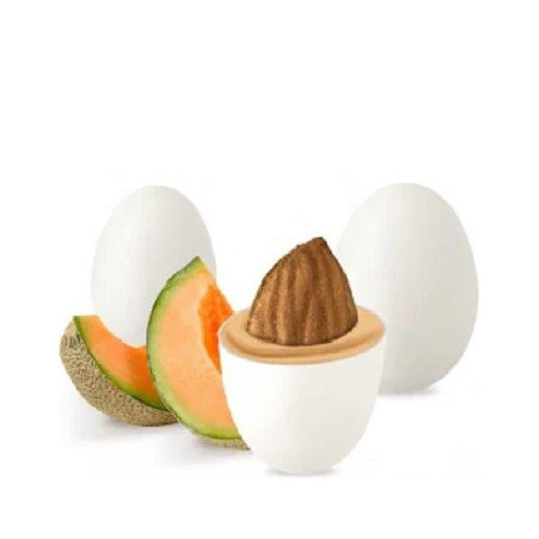 Confetti con mandorla tostata avvolta da uno strato di cioccolato bianco al gusto di melone, ricoperta da un sottile strato di zucchero.