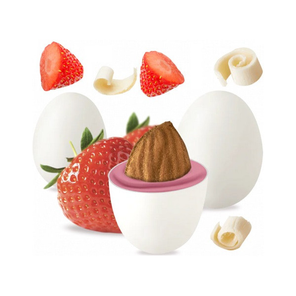 Maxtris Fragola, confetti ciocomandorla bianchi da 1 Kg: mandorla tostata ricoperta da cioccolato bianco gusto fragola e da un sottile stato di zucchero, ideali per confettata.