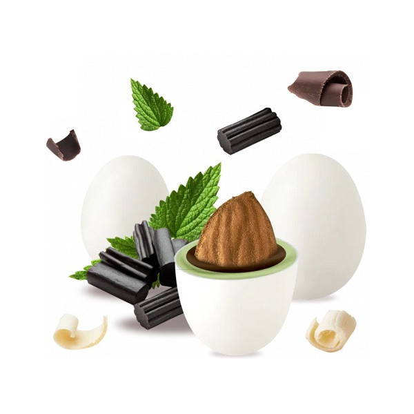 Confetti alla mandorla tostata avvolta da uno strato di cioccolato bianco e fondente al gusto di liquirizia e menta, ricoperta da un sottile strato di zucchero.