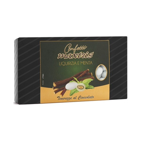 Maxtris Liquirizia e Menta 1 Kg: mandorla tostata avvolta da uno strato di cioccolato bianco e fondente al gusto di liquirizia e menta, ricoperto zucchero. Confetti bianchi per confettata cerimonia.
