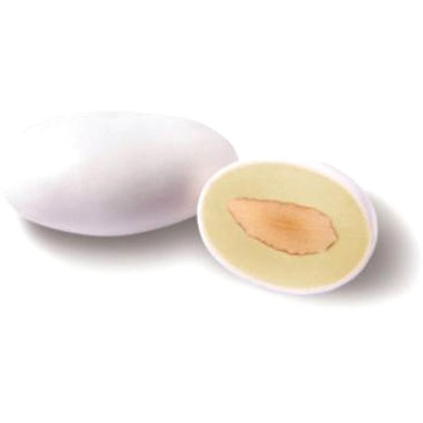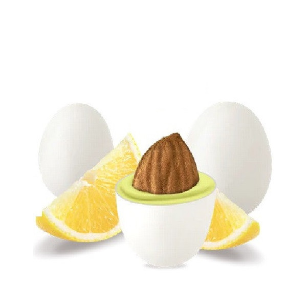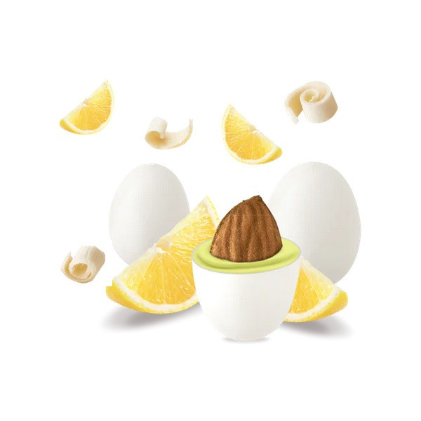 Mandorla tostata avvolta da uno strato di cioccolato bianco al gusto limone, ricoperto da un sottile strato di zucchero.