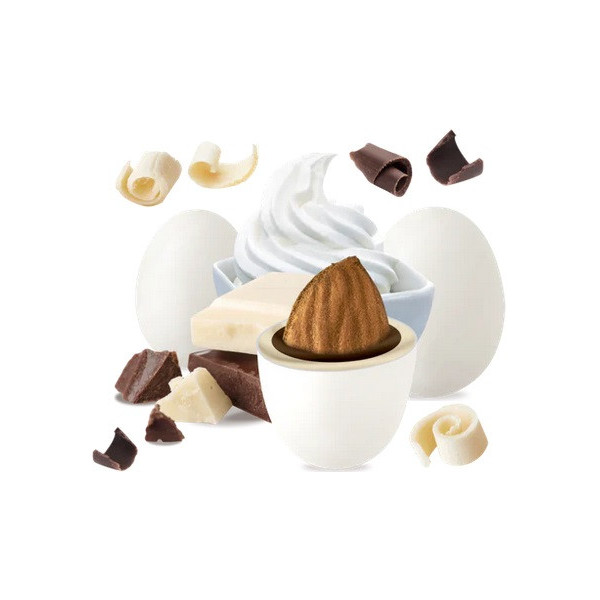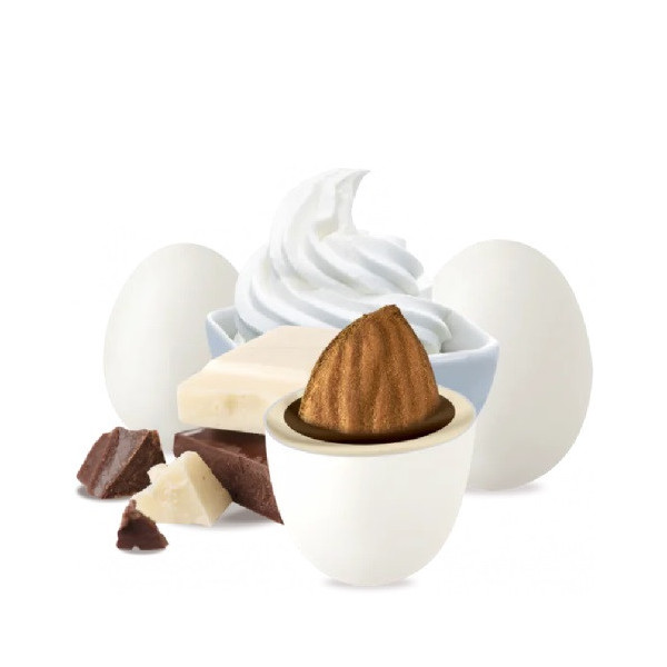 Mandorla tostata avvolta da uno strato di cioccolato bianco e fondente aromatizzato al gusto panna, ricoperta da un sottile strato di zucchero.