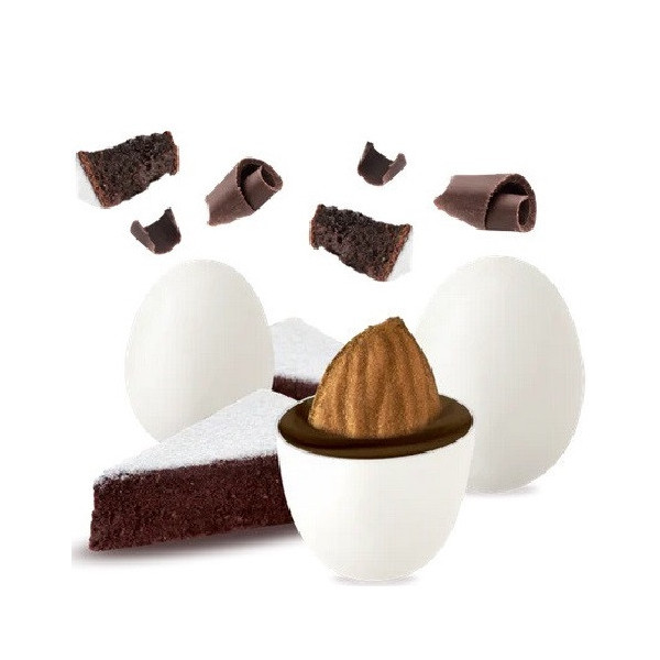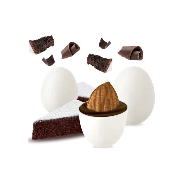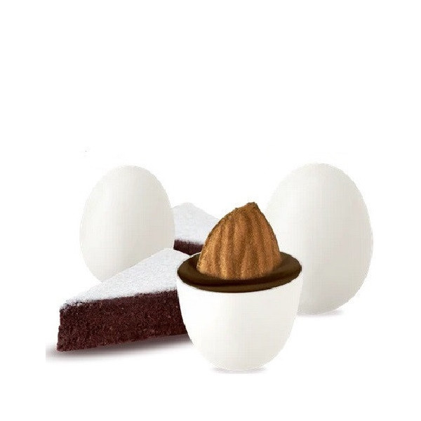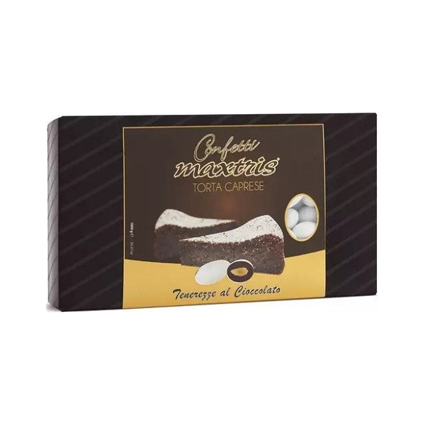 Maxtris Torta Caprese, confetti bianchi da 1 Kg: mandorla tostata avvolta da cioccolato fondente gusto torta caprese e da un sottile stato di zucchero, ideali per confettata.