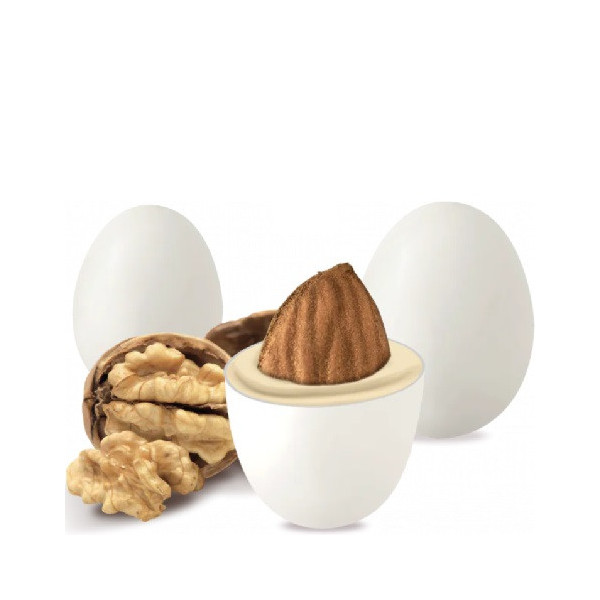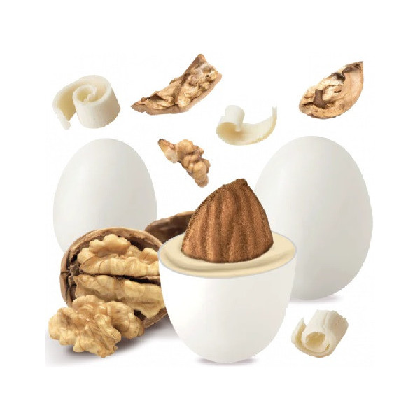 Confetti cioco-mandorla con mandorla tostata avvolta di cioccolato bianco aromatizzato alla Noce, ricoperta da un sottile strato di zucchero.